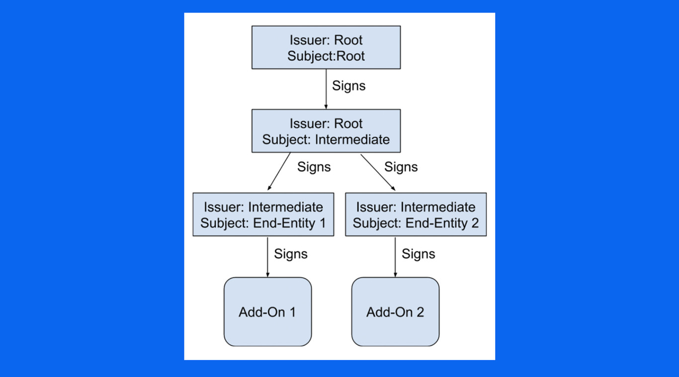 Este certificado é usado para assinar outro certificado, o intermediário. Esse certificado intermediário é aquele usado quando um complemento solicita a assinatura, de modo que quase todos os complementos compartilhem esse certificado.