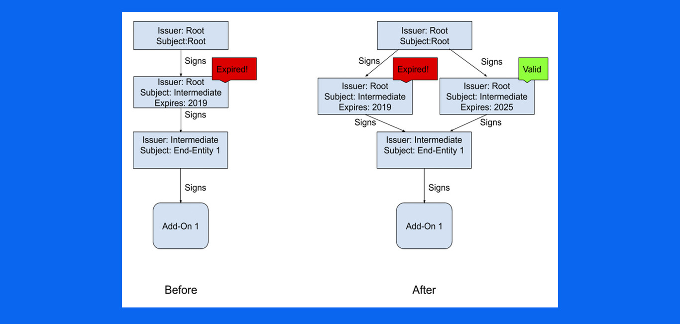 Rescorla diz que, a priori, se o problema é que o certificado deixou de ser válido, pode-se pensar que para resolver o problema seria suficiente gerar outro certificado válido. Essa solução não era viável , diz ele. Primeiro, porque o serviço de assinatura que eles usam não está preparado para entrar em massa, algo que retardaria o processo de assinatura dos mais de 15.000 complementos.
